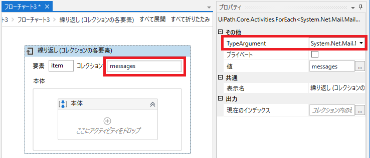 なぜ上記のような変数を選択しなければならないのかというと、Outlook メール メッセージを取得で作成したmessagesという変数の型がList<MailMassage>で、それに合わせなければならないためです。ここを設定しないとエラーになり、正しく実行されません。