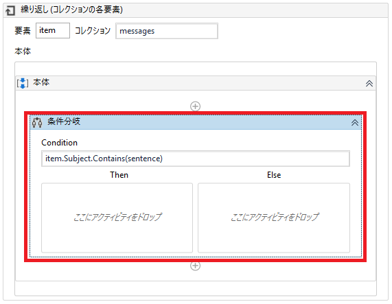 この意味は、messagesから繰り返しによって代入されたitemの中の、Subject(メールの表題)に、sentenceの中に代入されているキーワードのテストメールが含まれているか(Contains)、ということです。