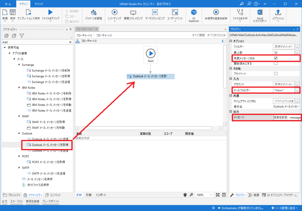 1.Outlook メール メッセージを取得で、未読のメッセージのみを変数に入れる。