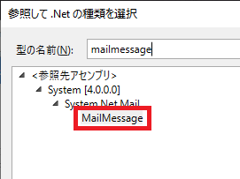 型のリストが表示されましたね。ここでmailmessageと入力をして検索をかけると、下記のように候補が出てきます。ここでSystem [4.0.0.0]とSystem.Net.Mailの下にあるMailMessageを選択します。