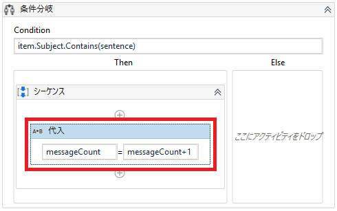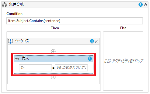 ここで、代入というアクティビティを条件分岐のThenの枠内に追加します。