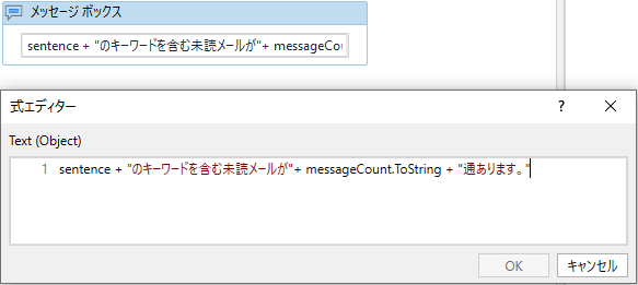 sentenceの場所には、この変数に入っているキーワードが表示され、続けて“のキーワードを含む未読のメールが”が表示され、続けてmessageCountの変数に入っているメールの数が次に来ます。その後にある.ToStringの意味ですが、これはmessageCountの変数の型がそのままテキストとして表示できないため、.ToStringでいったんStringという変数の型に変換してから表示しています。そして最後に“通あります。”がきて文章が完成します。