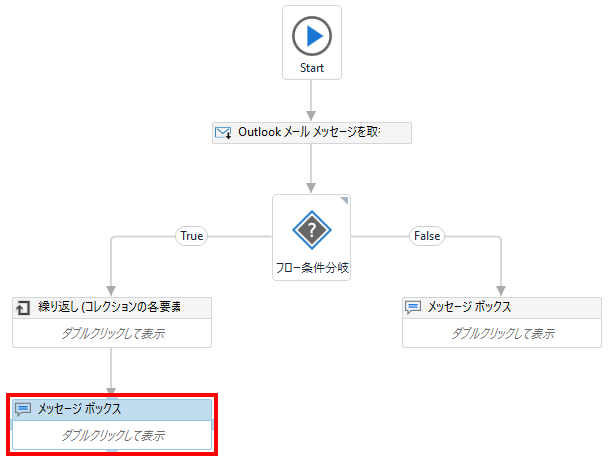 さらに、メッセージボックスを追加し、フロー条件分岐のFalse(右面)につなぎます。
